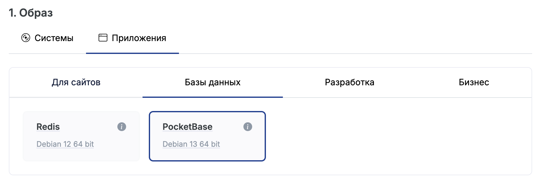 Для создания VPS с PocketBase достаточно выбрать это приложение на вкладке Приложения вот так: