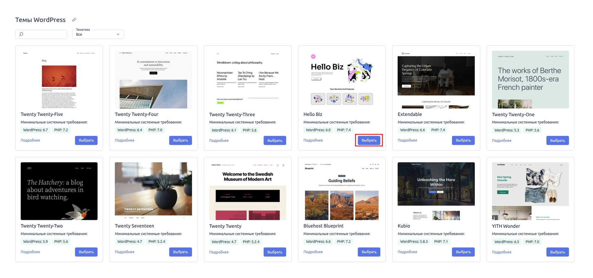 В галерее представлены разные темы — вы можете выбрать любую, которая понравится внешне. В дальнейшем тему всегда можно сменить через настройки WordPress.